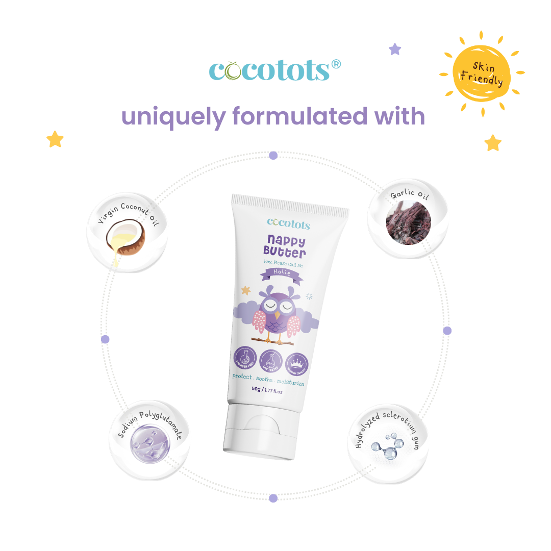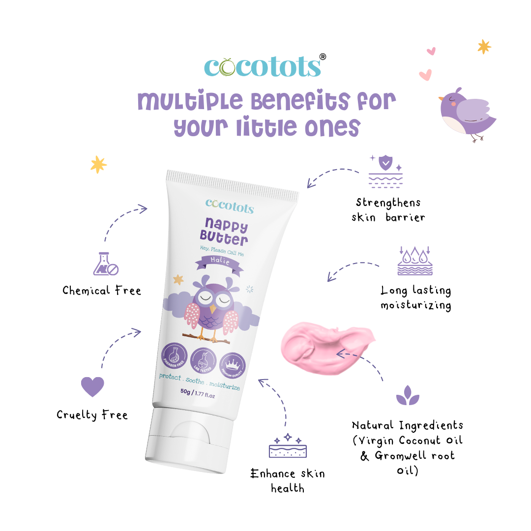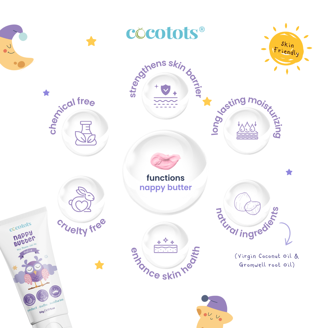 Description: With its natural ingredients, cocotots Nappy Butter uniquely crafted to soothe rashes on your baby's skin, delivers long lasting moisturising effects while strengthening skin barrier.